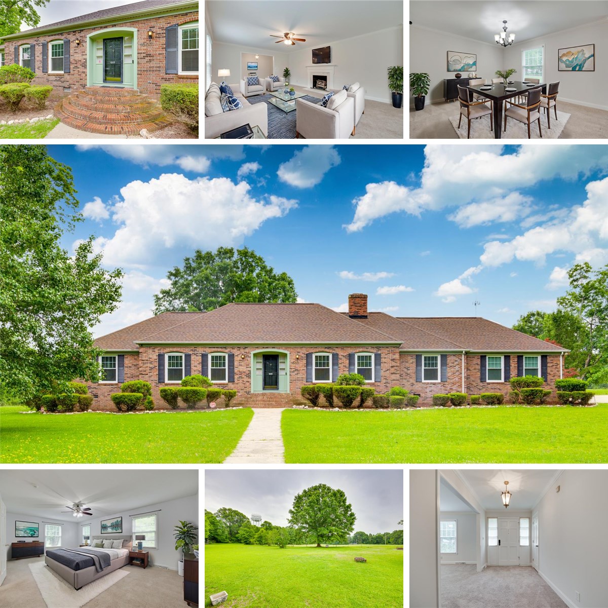 Welcome Home to a brick ranch on almost two acres! The Spacious kitchen offers SS appliances, tons of cabinet and counter space, an eat-in area, and opens to the sun room. The sun room has beautiful natural light and overlooks the open, serene backyard. The living room has a decorative fireplace with electric lighted logs for ambiance. The family room has nice built-ins and a working gas log fireplace. The primary suite is quite large with two closets and an en suite bath featuring a step-in shower and over sized vanity. The two primary bedrooms are nice-sized and share a full hall bath with a shower/tub combo and a large, oversized vanity and makeup area. The gorgeous backyard is private but open as there are no close neighbors.