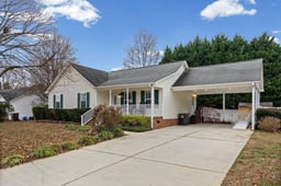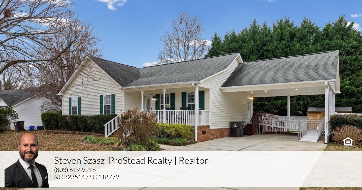 Charming, well-maintained ranch home in desirable Rock Hill—minutes to shopping, dining, and quick access to Charlotte. Enjoy easy one-story living with numerous updates and pride of ownership throughout. The living room features a gas-log fireplace, cathedral ceiling, recessed TV area, oversized ceiling fan, and surround-sound wiring. The kitchen offers stainless steel appliances, filtered water and ice-maker refrigerator, newer Corian countertops, updated faucet, GE dishwasher, and dining area, with a new sliding glass door opening to the back deck. The primary bath includes dual sinks, a garden tub with dual shower heads, and a new water-saving toilet. Secondary bedrooms and hall bath have fresh paint, with safety grab bars and updated toilet in the hall bath. A spacious laundry room provides cabinetry, hanging rod, and pantry storage. New HVAC system and gas water heater. Outdoor features include a covered front porch, rear deck with gas grill hookup, sealed concrete patio, storage building, and NEW Vinyl Privacy Fence. Parking and accessibility are enhanced with a double driveway, 400-sq-ft covered carport, motion lighting, and plenty of space for several cars. Roof approximately 5 years old. Move-in ready and conveniently located—this home is a must-see.